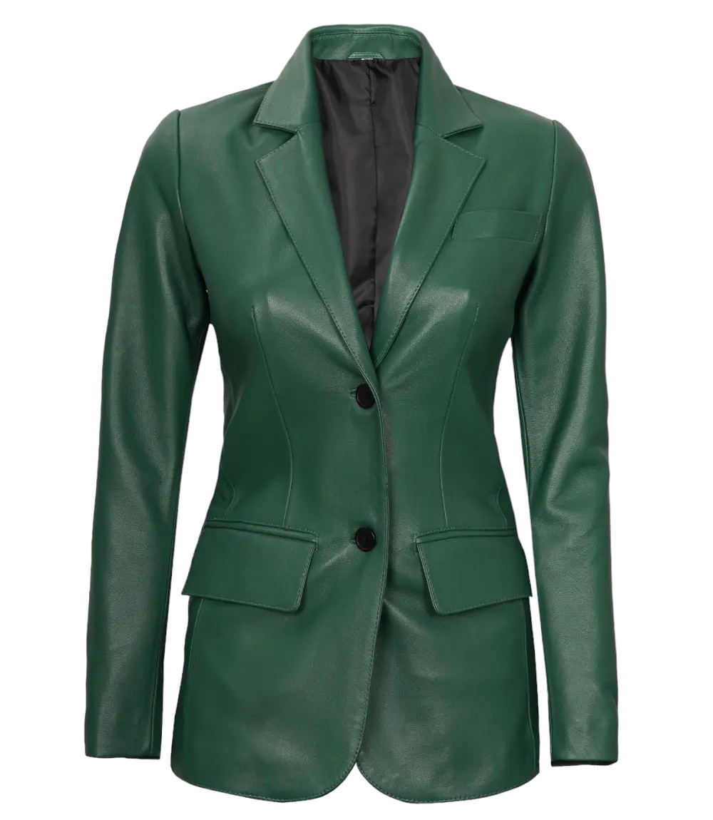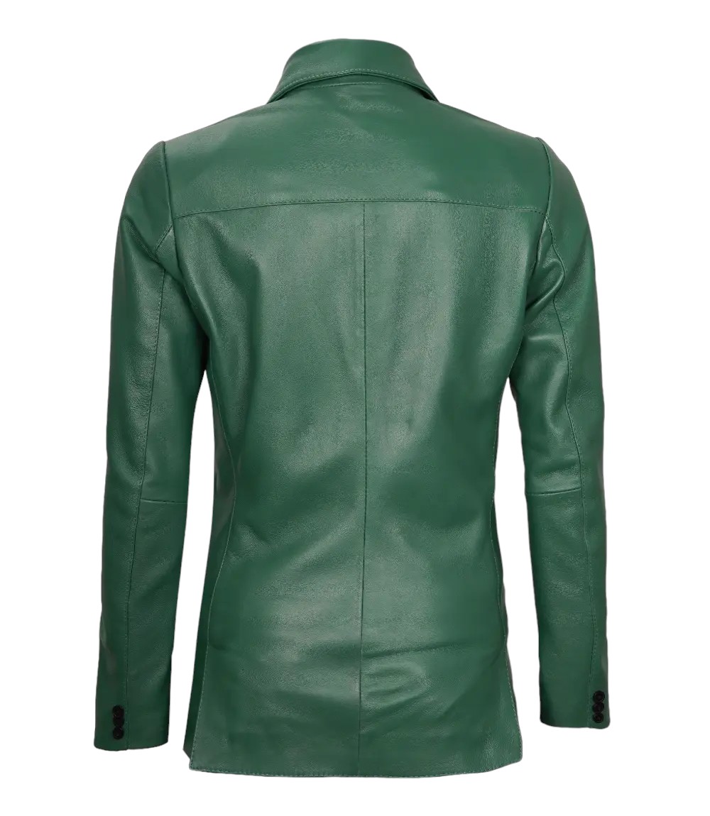 Enhance your professional and casual ensembles with our chic Women’s Green Two Button Leather Blazer. Crafted from real leather, this blazer effortlessly combines sophistication with a hint of edge.